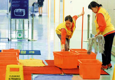 到傍晚八號報到柜臺上方也漏水,由于下面是行李輸送帶,無法放置地毯或毛巾吸水,清潔人員只有把水桶架到報到柜臺上方的框架上接水。另外水滴也滴落報到柜臺通道,除了架設(shè)黃色警示板提醒過往旅客注意,航空公司接待人員不時提醒旅客小心行走,避免滑倒受傷。