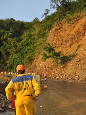 中新網10月25日電 蘇花公路106公里處再度坍塌,今天早上7點15分,公路局派出“怪手”和推土機,工程人員全力搶通,已恢復通車。