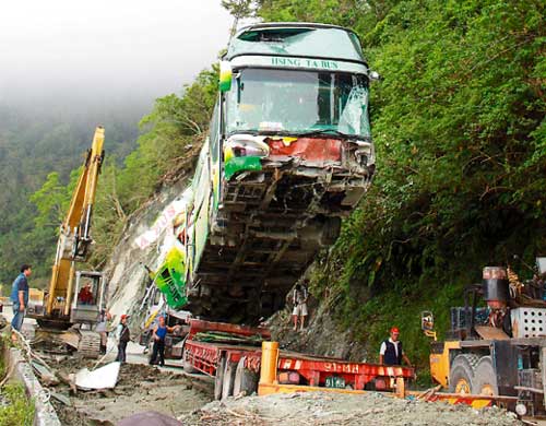 據(jù)報(bào)道,這輛車(chē)嚴(yán)重變形,車(chē)頭還掛有浙江團(tuán)的名牌,由于車(chē)內(nèi)塞滿(mǎn)土石,工人用鐵鍬從破損的車(chē)窗挖除土石,輪胎放氣,還出動(dòng)推土機(jī)幫吊起的游覽車(chē)喬位置,花了半個(gè)小時(shí),才順利把游覽車(chē)拖運(yùn)下山。