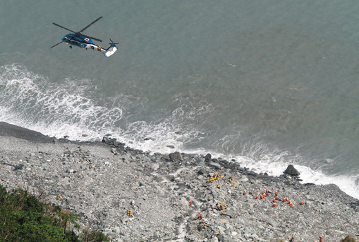 部署在崖頂?shù)摹跋朗稹碧厮讶藛T,25日上午不放過每一道山間裂隙,大隊(duì)人馬驚險(xiǎn)自300英尺以的斷崖垂降而下,在頭頂還有土石不斷崩落的險(xiǎn)境里,一英尺一英尺地往下確認(rèn),人員橘色操作服在慘白的土石崩落地形間十分明顯。一位特搜人員垂降到海際確認(rèn)積土深度,一點(diǎn)橘衣身后就是巨大的土石崩落群,形成強(qiáng)烈對比。