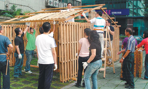 中新網(wǎng)10月27日電 據(jù)臺灣《聯(lián)合報》報道,臺灣房價居高不下,許多人被迫一生當(dāng)“房奴”。臺藝術(shù)家盧建銘、許淑真要提供平民技術(shù),示范用25分鐘蓋好6坪(1坪約是3.3平方米)木房,把建屋權(quán)從建商交還一般人,也讓房子從“私人昂貴商品”還原成“眾人共生共食處所”,這也將是臺灣第一個“現(xiàn)場演出”的建屋行動。
