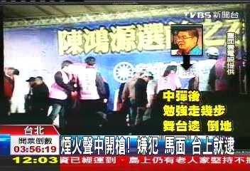 現(xiàn)場,槍聲混著煙火聲,煞那間,連勝文左臉頰滿是血,還堵住鼻孔,無法呼吸,工作人員幫忙清血,開槍嫌犯被逮,身上披著彩條的候選人,快步撤離舞臺(tái)。現(xiàn)場氣氛緊張,亂成一團(tuán),連勝文司機(jī)開車,協(xié)助送醫(yī),槍擊現(xiàn)場慘不忍睹。