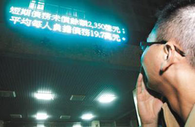 據(jù)報(bào)道,7日傍晚近7時(shí),“財(cái)政部”財(cái)政大樓正門和側(cè)門的電子看板上,以跑馬燈方式秀出“截至2010年11月底,‘中央政府’一年以上債務(wù)未償余額4.32818兆元(新臺幣,下同),短期債務(wù)未償余額2350億元;平均每人負(fù)擔(dān)債務(wù)19.7萬元”,以電子看板的形態(tài)仿效美國設(shè)置“債務(wù)鐘”。