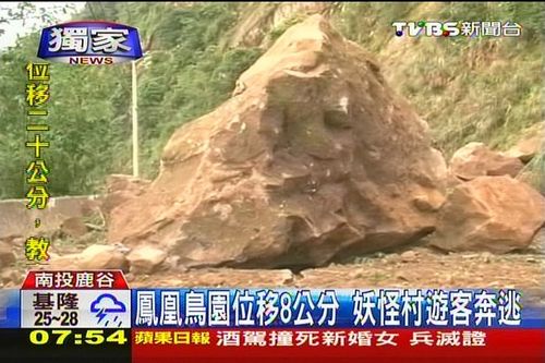 往鹿谷里面走,投56線也出現(xiàn)坍方,巨石滾下來,在路面上砸出1條長長的裂痕,田底村13戶住戶,還有30多名采茶工人,還受困在村內(nèi),等待救援;觀光景點(diǎn)鳳凰谷鳥園,也因?yàn)榈嘏7恚a(chǎn)生位移、樓梯下陷,地面高低落差將近8公分,園方也宣布暫時(shí)封園
