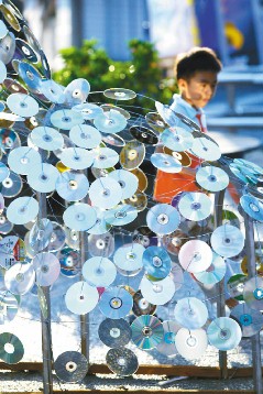 中新網(wǎng)11月8日電 據(jù)臺(tái)灣《聯(lián)合報(bào)》報(bào)道,午后陽(yáng)光泄照下,臺(tái)中市綠園道上,由廢光盤片所組合的裝置藝術(shù),吸引了路人的注目,也讓人感受到廢物利用的美意。