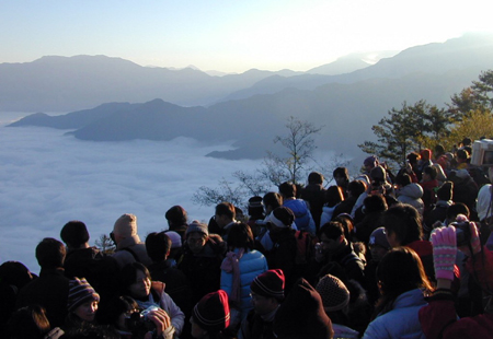 雖然寒流來襲,阿里山的最低溫只有攝氏二度,但大批游客仍摸黑起大早,將祝山觀日平臺擠得水泄不通。