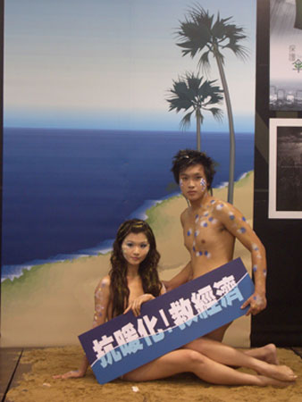 據(jù)“中央社”報道,記者會除了展示部分平面海報外,還請兩名大學(xué)生上演裸體真人海報秀,以“抗暖化、救經(jīng)濟(jì)”為口號,扮演“海王子”拯救因海水溫度上升面臨生存危機的“美人魚”。