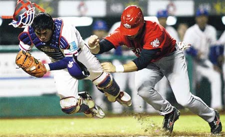 中新網(wǎng)3月11日電 北京奧運棒球資格賽昨晚迎來中國臺北隊與加拿大隊之戰(zhàn),由于攸關(guān)兩隊名次,比賽過程充滿火藥味與緊張氣氛。可惜中國臺北隊沒能守住最后關(guān)卡,九局上被加隊追平后,延長賽十局上再失一分,終場以五比六吞下首敗。
