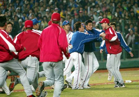 據(jù)臺灣媒體報道,這場在臺中舉行的大戰(zhàn)中,也出現(xiàn)比賽之外的不必要插曲。中國臺北隊球員力阻加拿大隊追平分,情緒自然激昂,卻沒想到球員額外的情緒發(fā)泄惹惱了加拿大球員,造成雙方球員跑入場中推擠理論,連球迷也紛紛丟擲雜物進(jìn)場,爆發(fā)八搶三奧運棒球資格賽開賽以來最大沖突。
