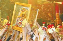 中新網(wǎng)4月14日電 經(jīng)過八天七夜繞境出巡,臺(tái)灣大甲媽祖神轎昨天回鑾到臺(tái)中縣大甲鎮(zhèn)。超過十萬名接駕信眾綿延十多公里。信眾的熱情,讓回鑾的預(yù)定時(shí)間比去年更延遲好幾個(gè)小時(shí),家家戶戶備妥香案跪拜,鎮(zhèn)瀾宮深夜十一點(diǎn)舉行安座大典,場(chǎng)面盛大熱情。