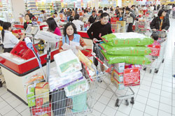 量販業(yè)者形容昨天是“最像假日的上班日”,尤其是夜間推出九折促銷,吸引不少民眾犧牲睡覺時間來采買,估計有二成來客選在凌晨消費(fèi)。家樂福夜間購物滿2000元,再送200元折價券,各店從凌晨起收銀線即大排長龍,汐止店甚至需排隊一個小時才能順利結(jié)帳。