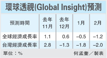中新網2月18日電 臺灣《經濟日報》18日頭條新聞報道說,環(huán)球透視(Global Insight)剛發(fā)布最新經濟預測,再度下修臺灣今年經濟成長率,并下修到負成長2.0%,甚至比全球經濟負成長1.2%還差。