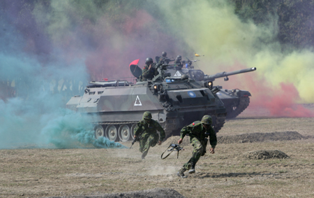 中新網(wǎng)1月24日電 臺(tái)灣軍方昨天在高雄舉行裝甲車操演,模擬對(duì)手滲透導(dǎo)彈基地的反制演習(xí),共出動(dòng)兩百多名士兵及數(shù)十輛坦克,場(chǎng)面相當(dāng)逼真。