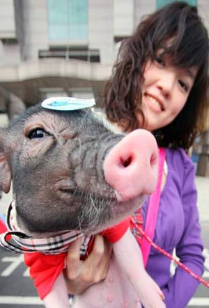 藍(lán)營“臺灣向前行,全民大游行”活動,一對年輕人牽著心愛的小豬豬一塊參加游行,引人不少目光。聯(lián)合報圖