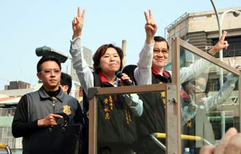 國民黨“副總統(tǒng)”候選人蕭萬長(右一)21日上午回故鄉(xiāng)嘉義市進(jìn)行車隊(duì)掃街拜票,呼吁鄉(xiāng)親要“家己人要挺嘉義人”,讓馬蕭過關(guān)。