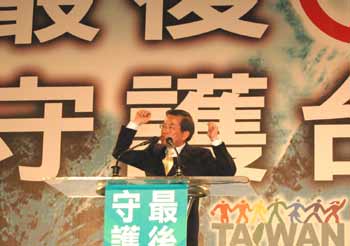 民進(jìn)黨候選人謝長(zhǎng)廷20日出席“最后一席、守護(hù)臺(tái)灣”晚會(huì),強(qiáng)調(diào)未來的命運(yùn)交給大家,如果沒當(dāng)選也絕不落跑,會(huì)守護(hù)臺(tái)灣。 “中央社”圖