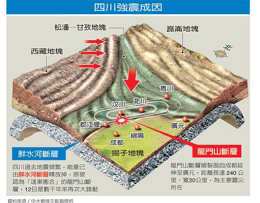 中新網(wǎng)5月16日電 據(jù)臺(tái)灣《聯(lián)合報(bào)》報(bào)道,臺(tái)灣“中央大學(xué)”地球科學(xué)系教授王乾盈說(shuō),四川強(qiáng)震成因被認(rèn)為“漸歸沉寂”的龍門山斷層“復(fù)活”發(fā)生錯(cuò)動(dòng),這個(gè)斷層自明朝以來(lái)被紀(jì)錄到動(dòng)的數(shù)據(jù)不多;十二日的錯(cuò)動(dòng)使當(dāng)?shù)氐貧ぬ殴,“喜馬拉雅山長(zhǎng)高好幾公尺”。