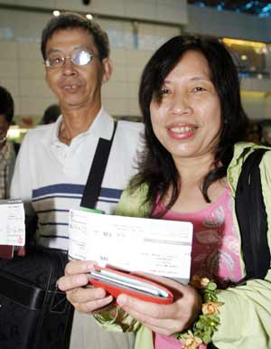 兩岸周末包機(jī)四日啟動(dòng),首班由臺(tái)北飛往上海的華航班機(jī)第一位報(bào)到旅客沈美珠(右)和陳進(jìn)興(左),興奮展示登機(jī)證。 “中央社”圖