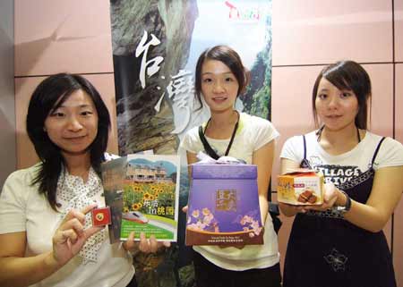 大陸觀光首發(fā)團四日抵臺,桃園縣也前往桃園機場宣傳桃園之美,其中包括宣傳大溪豆干、龍?zhí)敦曁、慈湖觀光導(dǎo)覽!爸醒肷纭眻D
