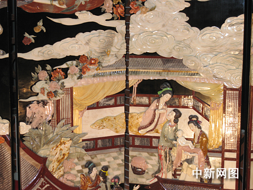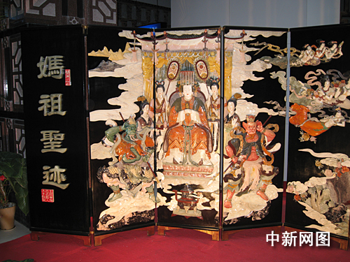中新網(wǎng)10月25日電 圖為位于中國(guó)閩臺(tái)緣博物館內(nèi)的巨幅玉石鑲嵌《媽祖》。作品高2米,長(zhǎng)30米,歷時(shí)5年,采用天然玉、石、珍珠、瑪瑙、翡翠、鉆石鑲嵌。該畫根據(jù)《敕封天后志》、《天后顯圣錄》以及民間有關(guān)媽祖?zhèn)髡f(shuō)繪成,以連續(xù)不斷的立體與浮雕畫面展現(xiàn)了媽祖救海難、護(hù)使節(jié)、解旱治病的圣跡。