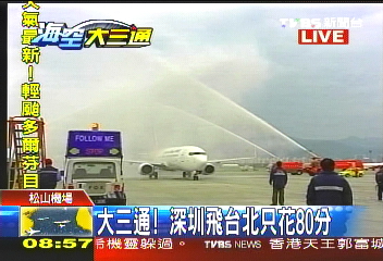 中新網(wǎng)12月15日電 15日上午8時(shí)40分,深圳航空ZH9095航班從深圳提前飛抵松山機(jī)場(chǎng),成為兩岸直接“三通”首個(gè)抵達(dá)臺(tái)灣的大陸航班。