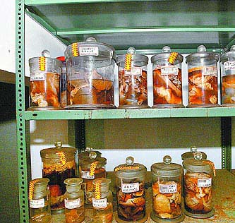 記者通過40米的通道,走到第二棟地勢(shì)較低的建筑內(nèi),記者攜帶探照燈,穿過一條白墻走道才轉(zhuǎn)彎進(jìn)入一個(gè)房間,抬頭赫見整排約50罐尸罐,嚇得忍不住后退。原來4排鐵架上擺放裝有各種器官和尸塊的罐子,猶如一座人體器官博物館,令人全身起雞皮疙瘩。