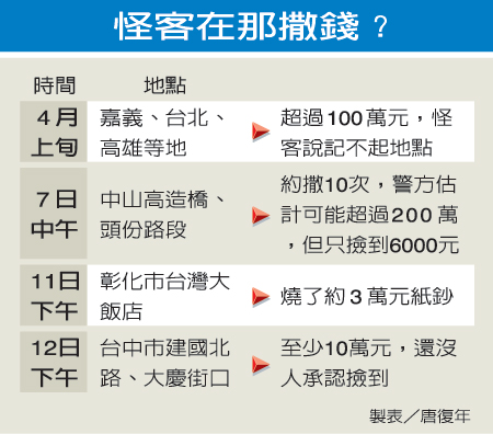 “鬼神啊,十萬,有夠沒?”撒錢怪客陳炳燈昨天在出租車上一路念念有詞,邊說邊往車外撒錢,司機葉坤煌覺得不對勁,趁他不注意,向警方報案。