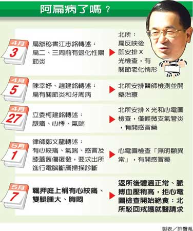 心臟學(xué)會(huì)秘書長(zhǎng)、臺(tái)大醫(yī)院內(nèi)科主治醫(yī)師黃瑞仁指出,根據(jù)扁日前在北所接受心電圖檢查,發(fā)現(xiàn)他有心搏快速、心軸左偏及電位傳導(dǎo)偏低等現(xiàn)象,若血壓偏高或心肌病變,走路就會(huì)喘、冒冷汗,這可經(jīng)由心臟超音波診斷,“并不需要?jiǎng)佑萌绫廪k所說的計(jì)算機(jī)斷層檢查”。