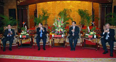 國(guó)民黨中常委蔣孝嚴(yán)亦題寫賀詞:“功績(jī)卓著”,贊揚(yáng)泉州臺(tái)商協(xié)會(huì)十二年來(lái)所取得的成績(jī)。而全國(guó)臺(tái)企聯(lián)會(huì)長(zhǎng)張漢文更親率全國(guó)各地百余臺(tái)企會(huì)長(zhǎng)及代表蒞會(huì)祝賀,并在慶典上號(hào)召?gòu)V大臺(tái)商朋友明年3月回臺(tái)灣投上自己莊嚴(yán)的一票。