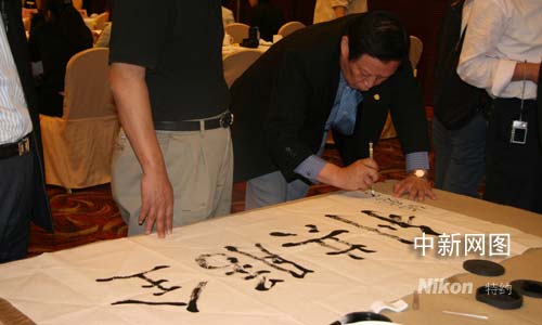 臺(tái)灣兵法專(zhuān)家傅慰孤親筆題詞“全勝共贏”遙祝兩岸和平。汪恩民 攝