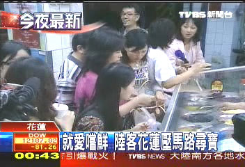 中新網(wǎng)6月18日電 據(jù)臺灣TVBS報道,大陸赴臺游踩線考察團(tuán)昨天晚上抵達(dá)花蓮,不顧先前勞頓,依舊精力旺盛,吃東西、買東西,對花蓮的名產(chǎn)樣樣覺得很新鮮;ㄉ彉I(yè)者半買半送,希望口碑能借由考察團(tuán)帶回大陸。