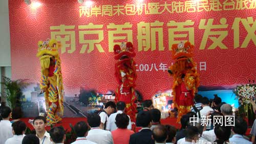 中新網(wǎng)南京7月4日電(記者 丁梅 朱曉穎)伴隨喧天的鑼鼓聲,三只金黃、大紅“獅子”跳上舞臺。今日早晨七點(diǎn),兩岸周末包機(jī)南京首航暨大陸居民赴臺旅游首發(fā)儀式在南京祿口國際機(jī)場隆重舉行。
