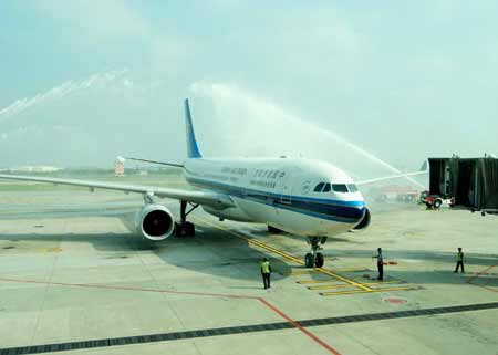 大陸居民赴臺觀光首發(fā)團四日上午搭乘南方航空抵臺,揭開兩岸交流新序幕。飛機抵臺時,受噴水儀式歡迎。“中央社”圖