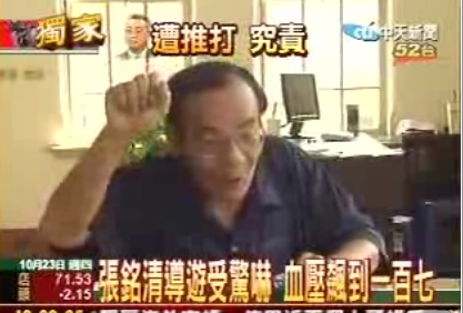 海協(xié)會副會長張銘清在臺遭襲事件,不但令國際震驚,就連臺南人自己也被嚇了一大跳。據臺灣中時電子報23日消息稱,當天擔任張銘清在孔廟的導游的江文章,說自己當時被嚇得腦袋一片空白,后來量血壓,竟然發(fā)現(xiàn)血壓飆高到170。
