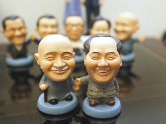 中新網(wǎng)10月27日電 兩岸交流進(jìn)一步加強(qiáng),國(guó)民黨黨史館與廠商合作訂制兩岸人物公仔,其中以蔣介石與毛澤東公仔銷售熱度最驚人,第一版已熱銷一空,正趕制第二版。