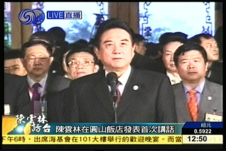 陳云林說,今天我在北京登機(jī)的時(shí)候,那里的天空晴空萬里,中午我們到達(dá)桃園機(jī)場(chǎng)的時(shí)候,到達(dá)圓山飯店的時(shí)候,外面是細(xì)雨綿綿,和風(fēng)宜人,它預(yù)兆著我們兩會(huì)的商談會(huì)圓滿成功。