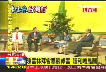 陳云林拜會辜嚴倬云,追思辜振甫推動兩岸關系的精神;辜嚴倬云首先贈上張大千的名作“和鳴鳥圖”給陳云林,象征兩岸“合鳴”。
