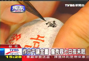中新網(wǎng)11月4日電 臺北“江陳會談”今天舉行,臺灣海基會準備了鑲有6000金字的“和平協(xié)商,共創(chuàng)雙贏”的藝術字畫,送給陳云林。據(jù)臺灣TVBS報道,字畫創(chuàng)作者、臺灣藝術家詹秀蓉透露,為了這幅字畫,她不眠不休花了7天時間,才在最后一刻完成。不過,見證兩岸歷史時刻,詹秀容說,她與有榮焉,所以分文不取。