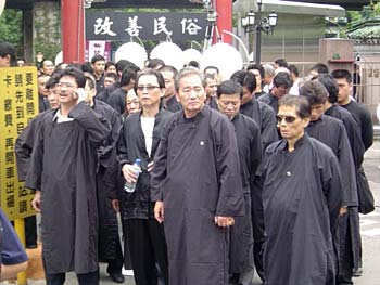 據(jù)臺(tái)灣中時(shí)電子報(bào)報(bào)道,2005年5月,在島內(nèi)素有“黑道仲裁者”之稱(chēng)的“蚊哥”許海清舉行喪禮,全臺(tái)各幫派動(dòng)員上萬(wàn)人以“輸人不輸陣”的氣勢(shì),身著各幫派及堂口制服,甚至以“黑色人龍”之姿繞街游行臺(tái)北街頭,甚至高調(diào)的舉辦記者會(huì),訂定“黑道平安日”,讓警方顏面無(wú)光。太“警政署”最后施以鐵腕,日后的任何一場(chǎng)黑道份子喪禮,均事前強(qiáng)力約制幫派份子參加,甚至強(qiáng)力掃蕩,昔日黑道喪禮的風(fēng)光,幾乎已不復(fù)見(jiàn)。