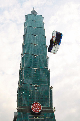 據(jù)臺灣《中華日報》報道,38歲的奧地利定點(diǎn)跳傘者Felix Baumgartner(中文譯為彭剛納爾)于11日在未經(jīng)一O一大樓許可情況下,從508米高的臺北一O一高樓的一露天觀景臺縱身跳傘。