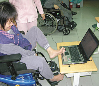 十八年前黃美秀讀埔里中學(xué)資源班,老師鼓勵(lì)她學(xué)電腦,六十六歲的祖母每晚陪她去上課,剛開(kāi)始練習(xí)用腳趾按鍵盤(pán)、撥動(dòng)鼠標(biāo),腳上好像綁著大石頭,苦練一星期后,熟練與靈活度已比“正!蓖瑢W(xué)還要好,F(xiàn)在她的黃金左腳,大小趾并用,一分鐘可輸入二十個(gè)字。