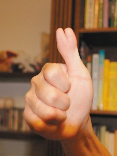 陳姓男子說,“大選”情緊繃,藍、綠立場愈來愈鮮明,他的右手大拇指硬是比別人多出一個指頭,時機敏感,他自嘲處境尷尬,豎大拇指,泛綠朋友恐錯當他比V,平日跟支持馬蕭的友人在一起,比起大拇指,明明就是V,就是支持2號馬英九,但又怕支持泛藍的朋友誤會他比“1”,是挺綠的。