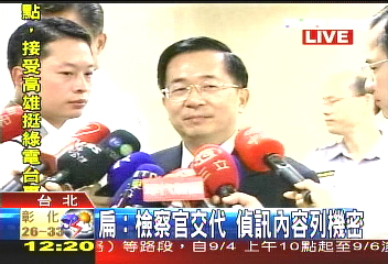 據(jù)臺(tái)灣媒體報(bào)道,陳水扁先于另一名應(yīng)訊的前臺(tái)灣“調(diào)查局長(zhǎng)”葉盛茂步出臺(tái)北地檢署。在坐上座車之前,陳水扁向現(xiàn)場(chǎng)媒體表示,檢察官今天特別交代,所有偵訊內(nèi)容都列為機(jī)密,不得對(duì)外公開。