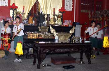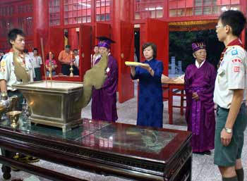 中新網(wǎng)9月28日電 08年嘉義市各界紀念大成至圣先師誕辰釋奠典禮今天上午如期在嘉義公園內孔廟舉行。因薔薇臺風來襲,顧及學生安全,今年首度取消佾舞,并創(chuàng)下由童軍擔任禮生的先例。不少民眾和小朋友冒著風雨到場觀禮,并在祀典后領取智能糕,期能增長智能、學業(yè)進步。