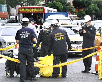 據(jù)臺(tái)灣《聯(lián)合報(bào)》報(bào)道,14日中午十一點(diǎn)十六分,臺(tái)北市消防局和環(huán)保署接獲通報(bào),指中華路、廣州街口有不明粉末飄散,氣味刺激,騎摩托車的行人難受地將車子?吭诼愤叴。消防隊(duì)除派救護(hù)車載運(yùn)傷員,也出動(dòng)化學(xué)災(zāi)害處理車到場(chǎng)應(yīng)變。