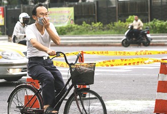 一位民眾騎自行車經(jīng)過(guò),趕緊捂住口鼻。(圖片來(lái)源:臺(tái)灣《聯(lián)合報(bào)》)
