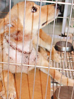 據臺灣TVBS報道,三只狗眼神無助,虛弱的躺在籠中,它們的脖子都有勒痕,深可見肉。其中一只狗被勒得頭部腫脹,另一只小時候就被人用塑料繩捆住脖子,長大居然變成奪命繩。最嚴重的一只狗,脖子被橡皮筋割喉,脖子潰爛小命都快不保。