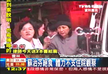 民進(jìn)黨籍云林縣長(zhǎng)蘇治芬獄中絕食,已超過250個(gè)小時(shí)沒有吃東西,體力不支,兩度被送到醫(yī)院觀察。圖片來(lái)源:臺(tái)灣TVBS