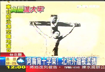 臺北看守所外面的墻上,被人畫了一幅陳水扁被釘在十字架上的涂鴉。圖片來源:臺灣TVBS