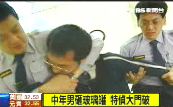 上午10點(diǎn)半,一名年約30出頭的男子在特偵組附近徘徊,突然以手中的玻璃罐扔擲特偵組大門(mén),大門(mén)口玻璃門(mén)應(yīng)聲碎裂,而砸門(mén)人士也立刻遭到法警制服,并帶回偵訊。